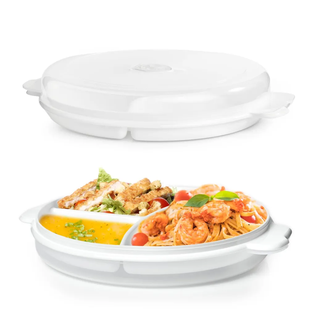 Diese Mikrowellenteller sind BPA frei und mit Belüftung. Die Teller sind mit einer Belüftung ausgestattet. Dadurch kann das Wasser beim Erwärmen verdunsten und dank des Deckels bleibt die Mikrowelle sauber.
