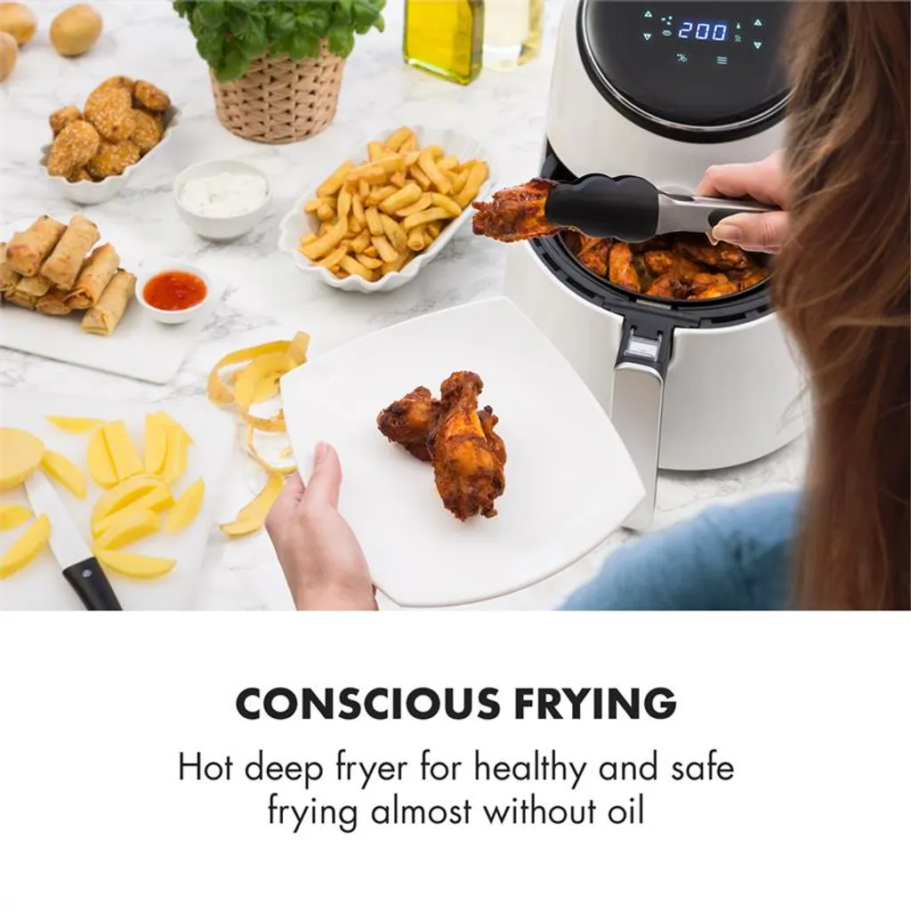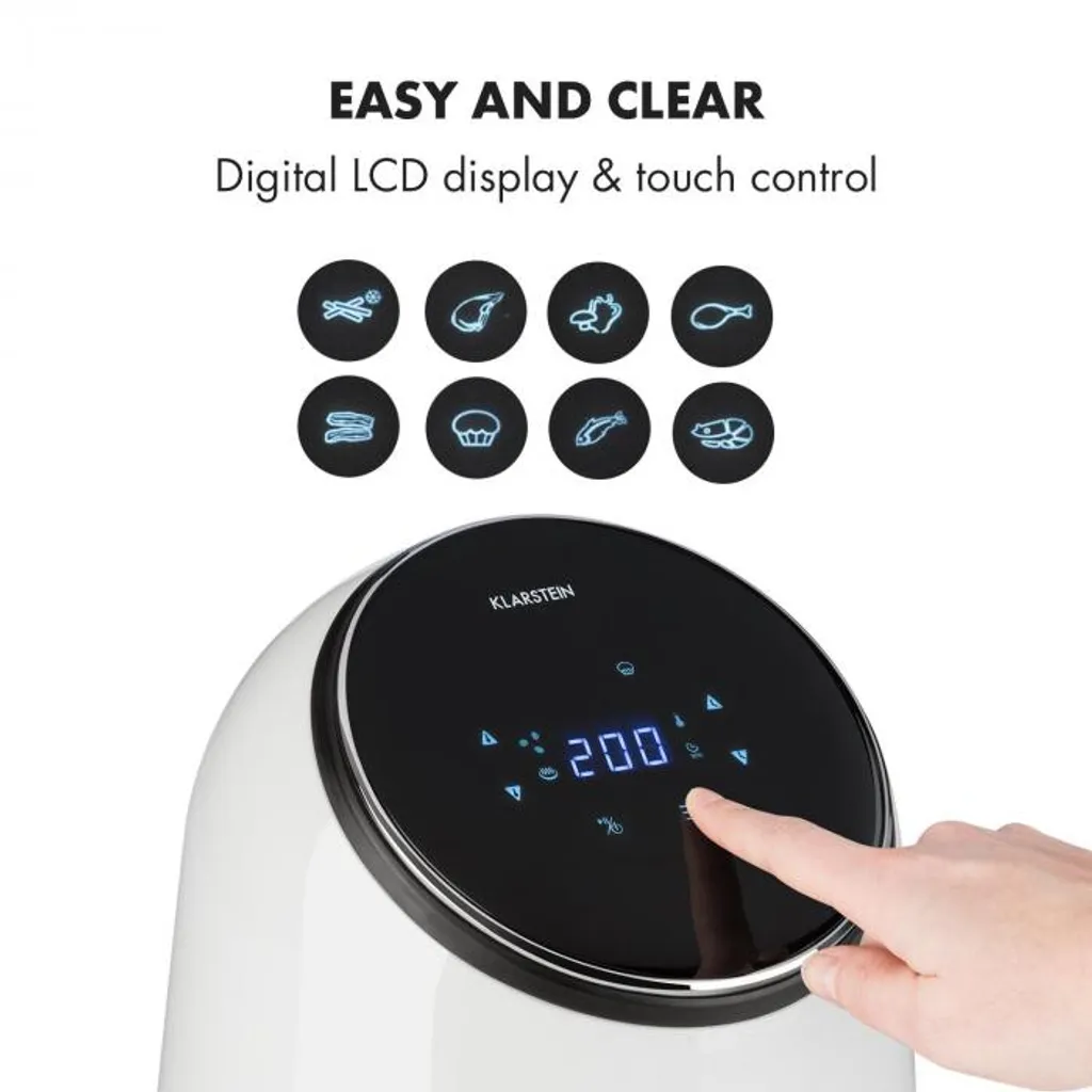 Bewusst Frittieren: Heißluftfritteuse fur gesundes und sichere Frittieren ohne Öl, Einfach und Übersichtlich: kinderleichte Steuerung mit digitalem LCD-Display & Touchcontrol, Ohne Öl & Fett: keine unangenehmen Fettgerüche und bis zu 80% weniger Kalorien als konvetionelle Fritteusen, Rasante Knusprigkeit: 1300 Watt starkes Umluftsystem mit 360° Luftzirkulation für gleichmäßige Hitzeverteilung, Blitzschnell Heiß: erreicht Betriebstemperaturen zwischen 80 und 200 °C innerhalb von 3 Minuten, Kein Anbacken: Grillkorb mit CeraPlus-Antihaftbeschichtung für einfache Entnahme und Reinigung, Für große Portionen: 2.5 Liter großer Grillkorb und 3.5 Liter große Wanne