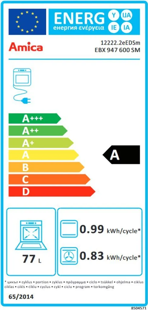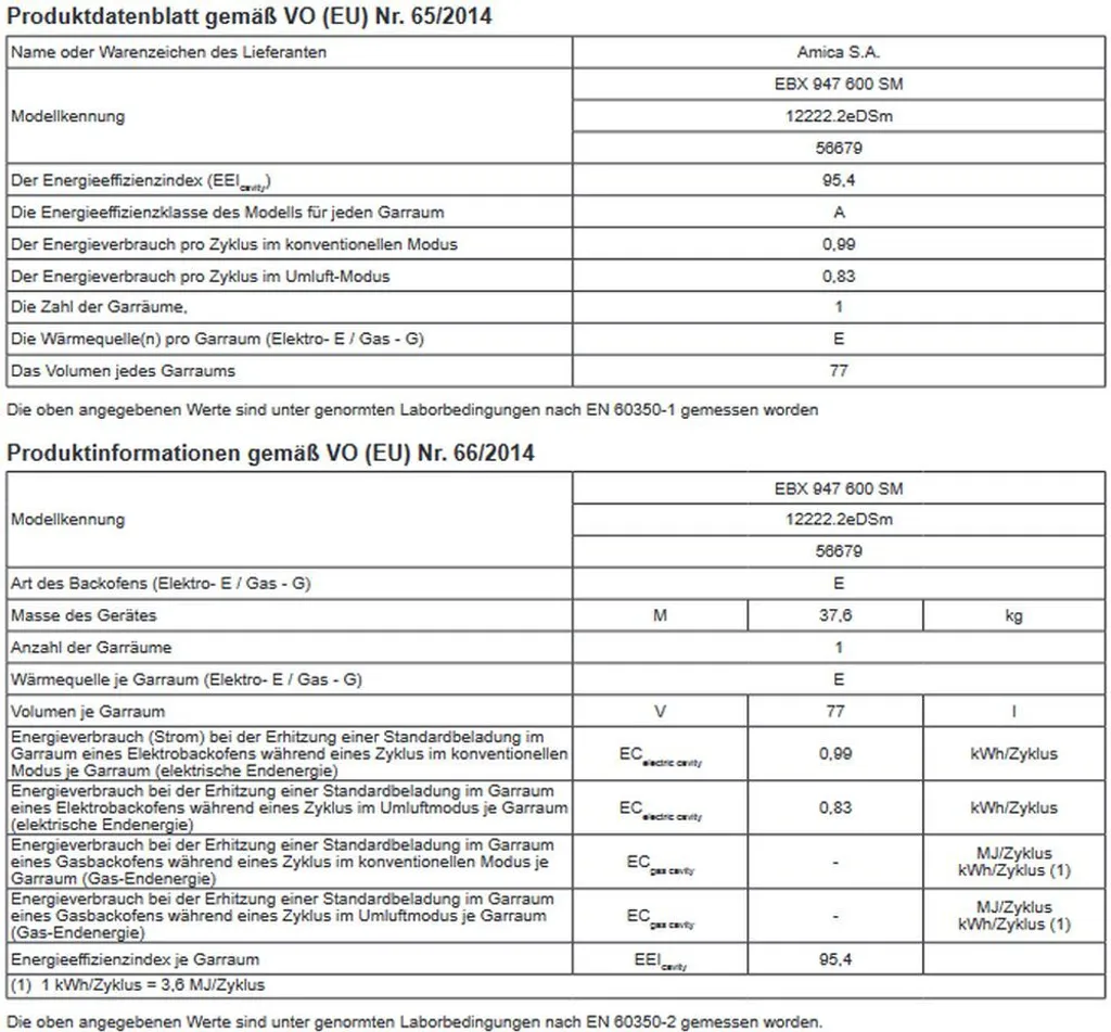 - Energieverbrauch konventionell: 0,99 kWh, Heißluft/Umluft: 0,83 kWh