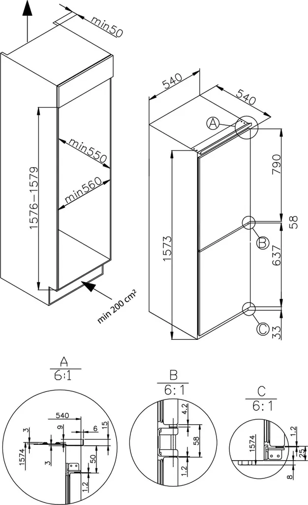 - Nische (HxBxT): 1576 – 1579 x 560 x 550 mm