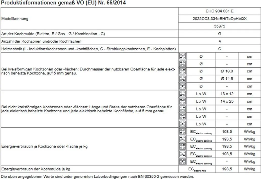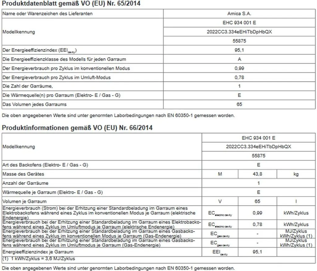 – Energieverbrauch konventionell: 0,99 kWh, Heißluft/Umluft: 0,87 kWh