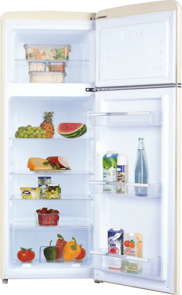 Retro-Kühl-Gefrierkombination, Kühlteil: 3 Glasablagen (Sicherheitsglas), verstellbar,1 transparente Obst/Gemüseschale mit Glasabdeckung, 3 Türablagen, Gefrierteil: 1 Ablage, Gerätegewicht: 41 kg