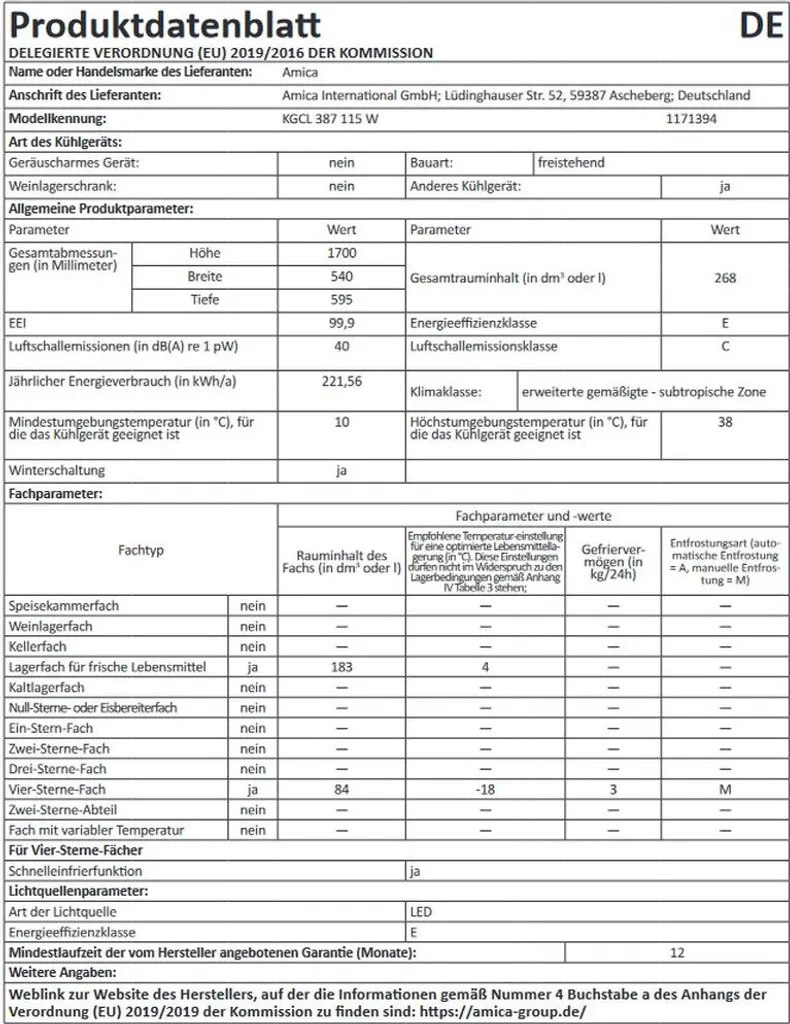 Amica KGCL 387 115 W – Kühl-/Gefrierschrank – Bottom-Freezer – Breite: 54 cm – Tiefe: 59.5 cm – Höhe: 170 cm – 268 Liter – – weiß