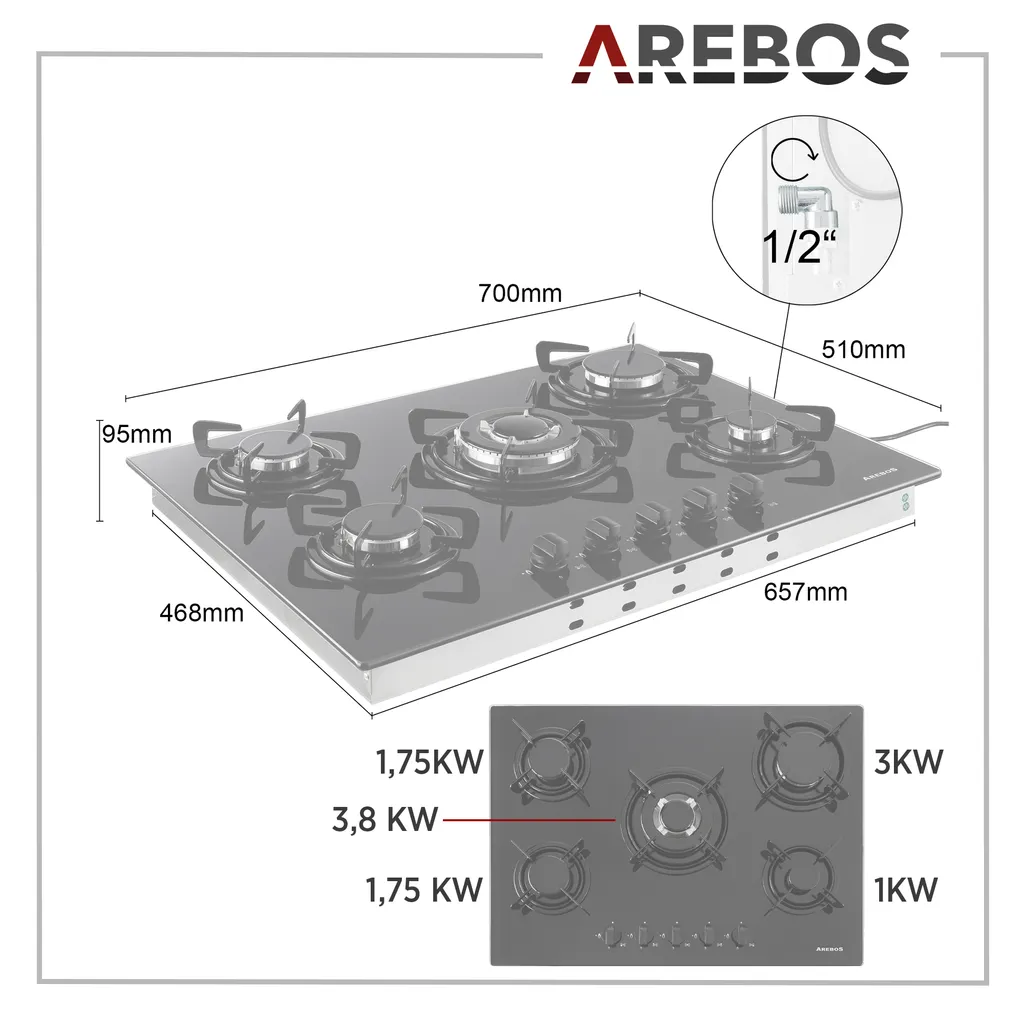 [LEISTUNGSSTARKES GASKOCHFELD] AREBOS 5-Brenner Gaskochfeld. Das Kochfeld verfügt über 2 Schnellbrenner mit 3800 & 3000 W, 2 Halbschnellbrenner mit 1750W sowie einem Brenner mit 1000 W. Es eignet sich ideal für jeden Einsatz, ob Sie nun braten, kochen, dünsten oder frittieren ist ganz egal.