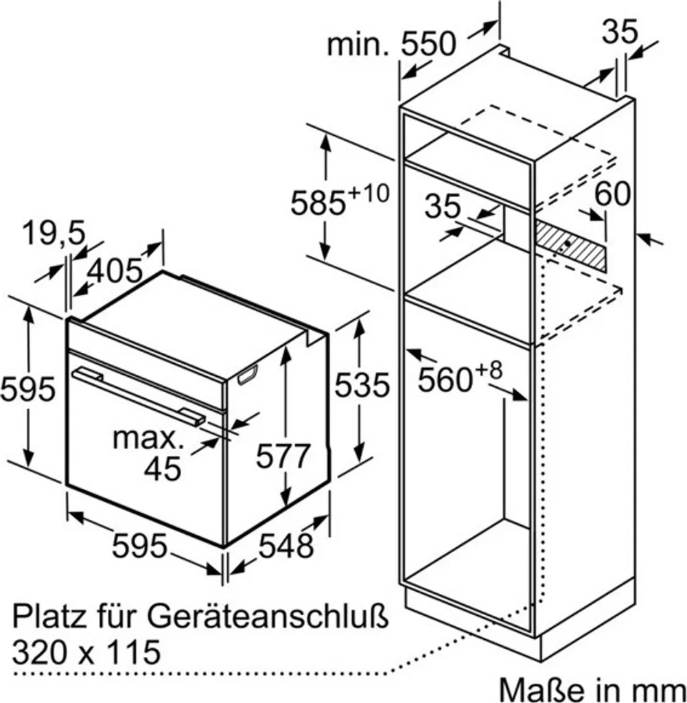 - Nischenmaße (HxBxT): 585 – 595 x 560 – 568 x 550 mm