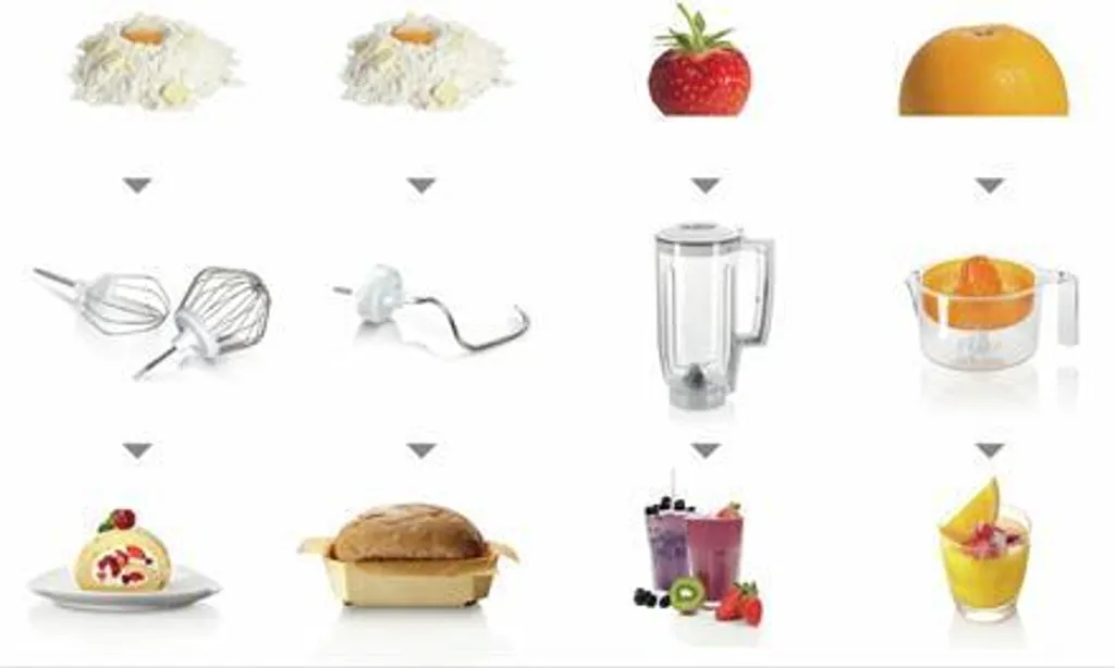 Lieferumfang Kunststoff-Mixeraufsatz 1,25 l, Rühr- / Schlagbesen, Zitruspresse, Zubehörtasche dunkelgrau, Metall-Knethaken, Rezept-DVD