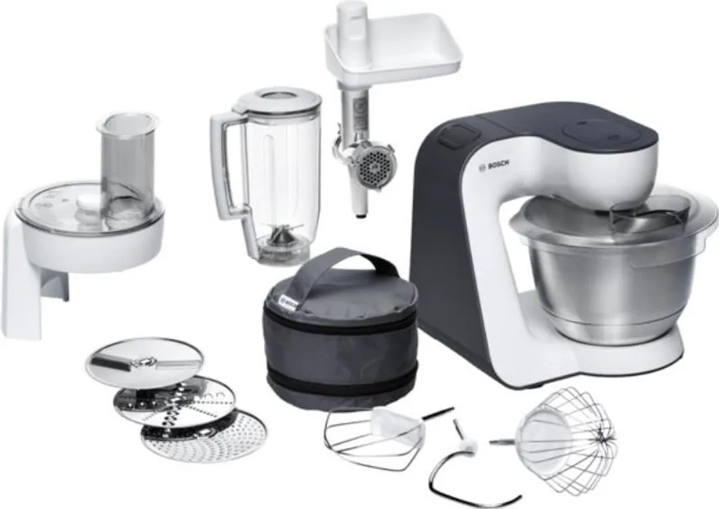 - Umfangreiches Zubehör: Knethaken, Schlag- und Rührbesen, Duchlaufschnitzler mit 3 Scheiben, Fleischwolf, 1,25-l-Mixer-Aufsatz, Deckel mit Einfüllöffnung, Zubehörtasche