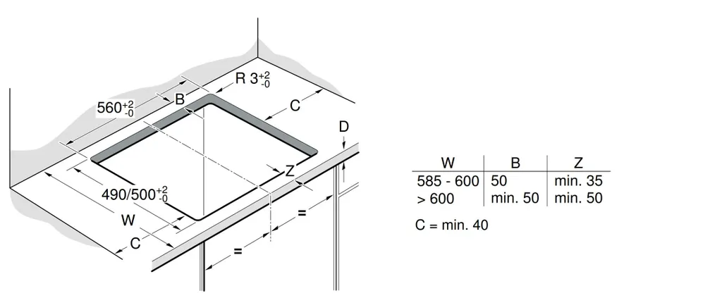 - Erforderliche Nischenmaß: Höhe 51 mm x Breite 560 mm x Tiefe 490-500 mm