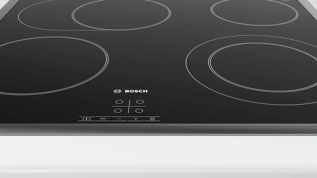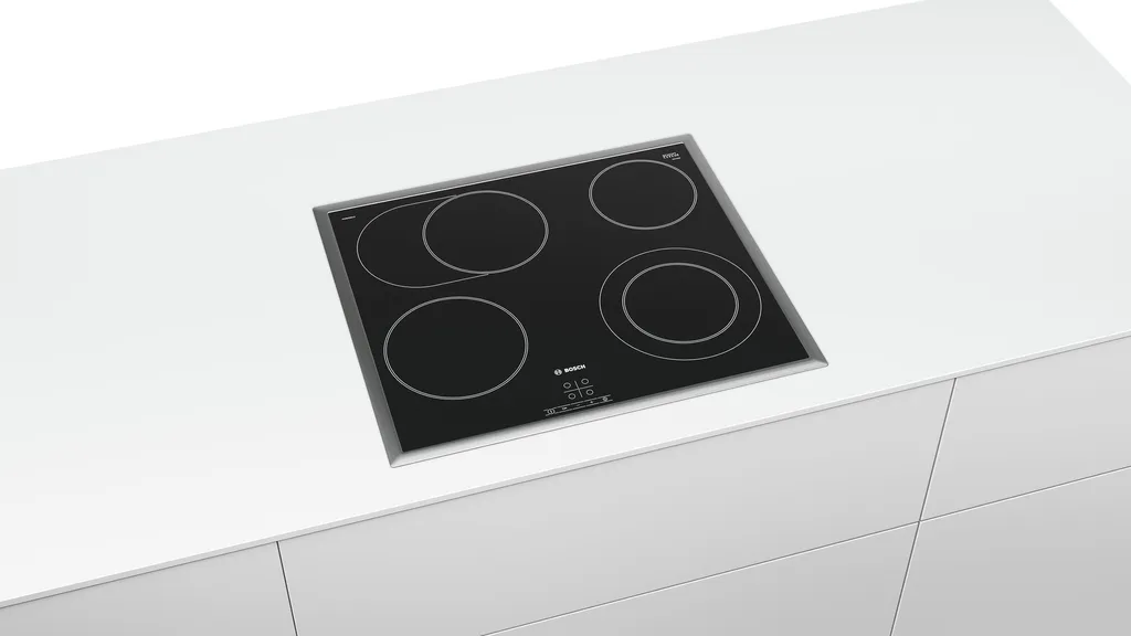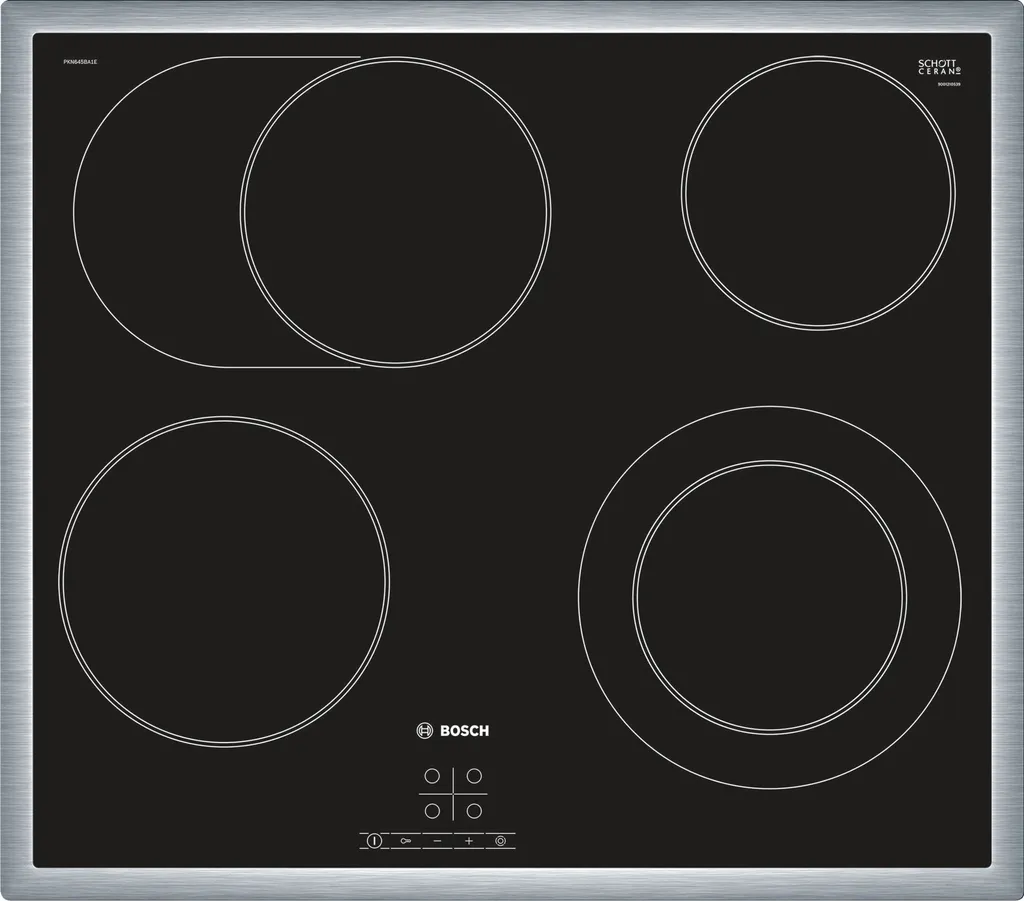 Das autarke Kochfeld Bosch PKN645BA1E mit umlaufenden Edelstahl-Rahmen bietet vier Elektro-Kochzonen, davon eine Bräterzone und eine Zweikreis-Kochzone. Die 17 Leistungsstufen lassen sich bequem über TouchSelect einstellen und die Glaskeramik-Oberfläche ist leicht zu reinigen. In puncto Sicherheit überzeugt das PKN645BA1E mit einer Kindersicherung, einer 2-stufigen Restwärmeanzeige und einer automatischen Sicherheitsabschaltung.