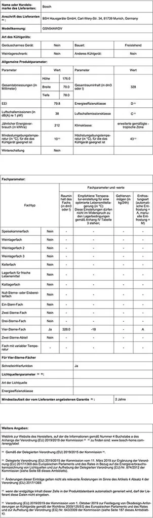 – Durchschnittlicher Energieverbrauch in Kilowattstunden pro Jahr (kWh/a) (EU 2017/1369): 212 kWh/a