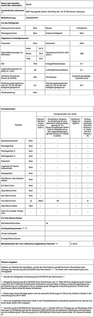 – Durchschnittlicher Energieverbrauch in Kilowattstunden pro Jahr (kWh/a) (EU 2017/1369): 222 kWh/a