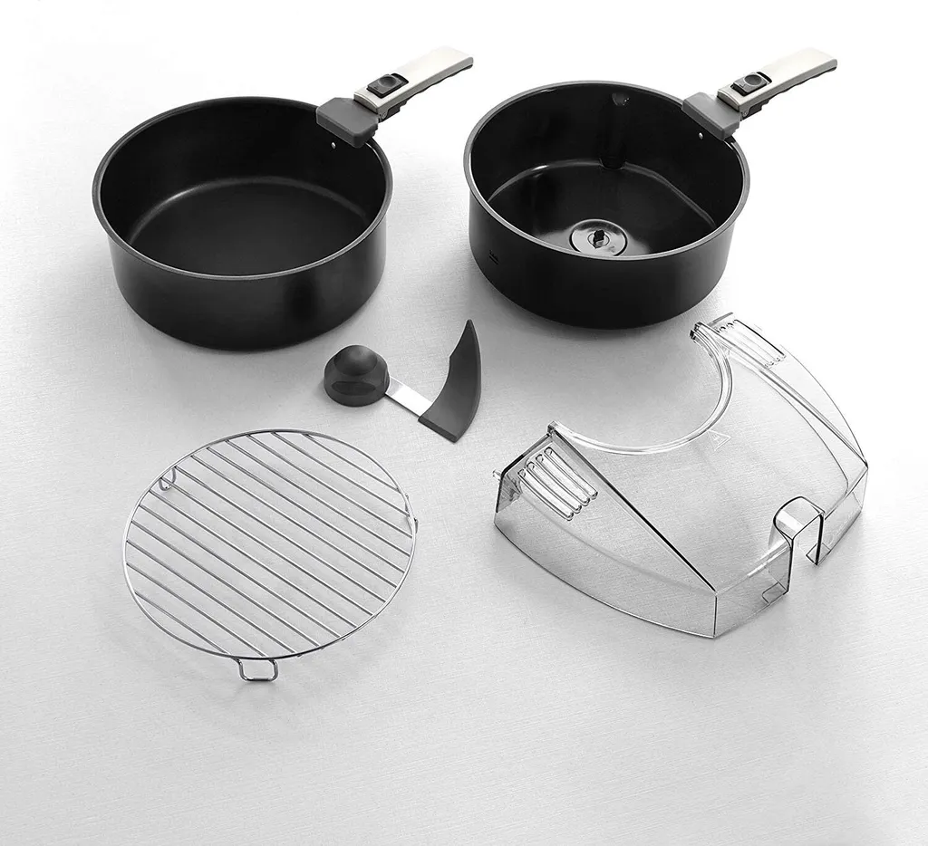 Mit vielseitigem Zubehoer: 2. Schuessel mit glattem Boden fuer noch einfachere Zubereitung von Pizza und Kuchen und Edelstahl- Grilleinsatz fuer noch mehr Rezeptvielfalt.