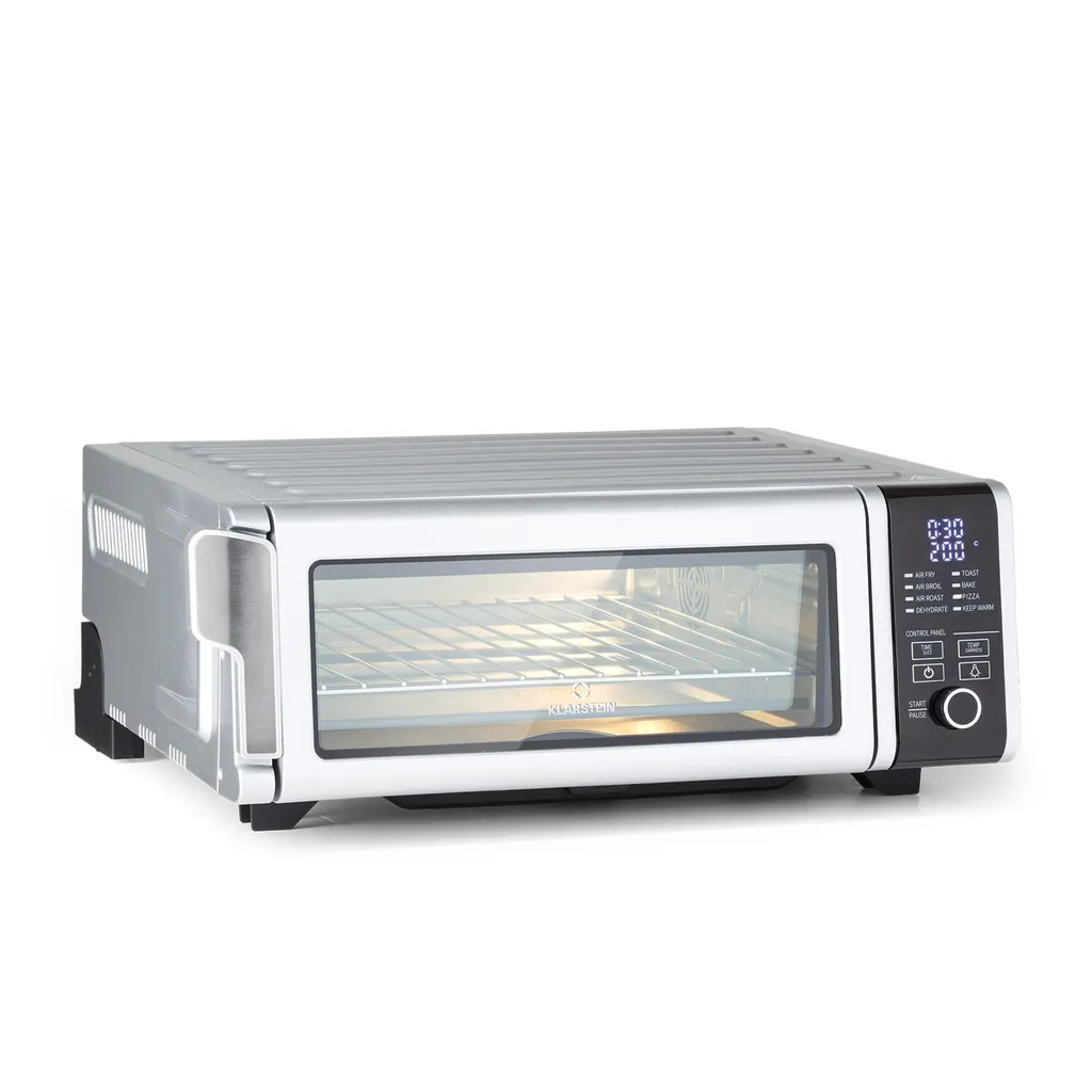 Die Klarstein Vita-Crisp Heißluftfritteuse Ist Ein Schlanker Alleskönner In Der Küche. Ihre 8 Unterschiedlichen Funktionen – Frittieren, Barten, Grillen, Dörren, Toasten, Backen, Warmhalten Und Pizza-Modus – Kannst Du Ganz Bequem über Das Frontseitige Display Mit Drehknopf Einstellen. Das Vierteilige Zubehör-Set Liefert Dir Alles, Was Du Für Heiße, Knusprige Snacks Brauchst. Dank Des Geräumigen Innenraums Wird Die Vita-Crisp Spielend Mit 33-cm-Pizzen Fertig. Die Reinigung Gestaltet Sich Dank Cle