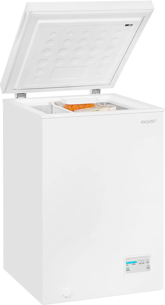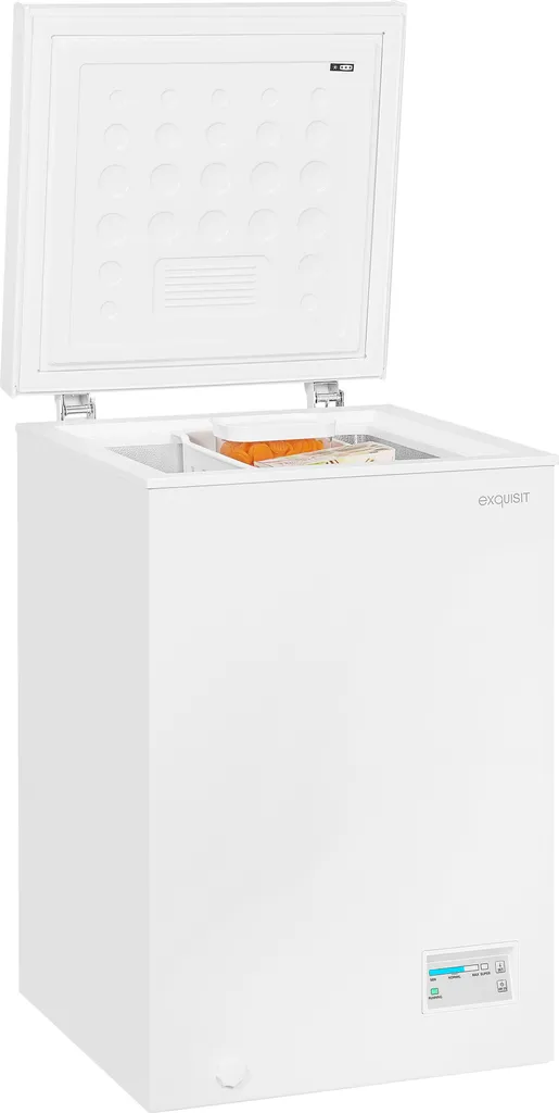 Die Gefriertruhe ermöglicht Ihnen das sorgenfreie Lagern über einen längeren Zeitraum. Insgesamt stehen Ihnen 98 l Nutzinhalt zur Verfügung. Das Gerät in der Farbe Weiß hat die Abmaße 84,5 x 54,5 x 54,5 cm (Höhe/Breite/Tiefe) und hat die Energieeffizienzklasse E (Skala Energieeffizienzklasse A bis G). Durch seine freistehende Bauart lässt es sich an jedem Ort aufstellen und in Betrieb genommen werden. Der 4*-Gefrierbereich verfügt über eine Kapazität von 98,0 l und bietet den idealen Ort für Eis, Tiefkühlpizza und alles andere. Eine spezielle Schnell-Gefrierfunktion sorgt dafür, dass Ihre Lebensmittel in kürzester Zeit eingefroren werden. Über ein gut lesbares Display haben Sie die gegenwärtige Temperatur jederzeit im Blick und können bequem einzelne Funktionen des Gerätes steuern.