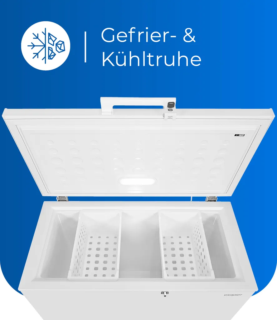 Die Gefriertruhe ermöglicht Ihnen das sorgenfreie Lagern über einen längeren Zeitraum. Insgesamt stehen Ihnen 308 l Nutzinhalt zur Verfügung. Das Gerät in der Farbe Weiß hat die Abmaße 85,0 x 112,0 x 70,0 cm (Höhe/Breite/Tiefe) und hat die Energieeffizienzklasse E (Skala Energieeffizienzklasse A bis G). Durch seine freistehende Bauart lässt es sich an jedem Ort aufstellen und in Betrieb genommen werden. Der 4*-Gefrierbereich verfügt über eine Kapazität von 308,0 l und bietet den idealen Ort für Eis, Tiefkühlpizza und alles andere. Eine spezielle Schnell-Gefrierfunktion sorgt dafür, dass Ihre Lebensmittel in kürzester Zeit eingefroren werden. Über ein gut lesbares Display haben Sie die gegenwärtige Temperatur jederzeit im Blick und können bequem einzelne Funktionen des Gerätes steuern.