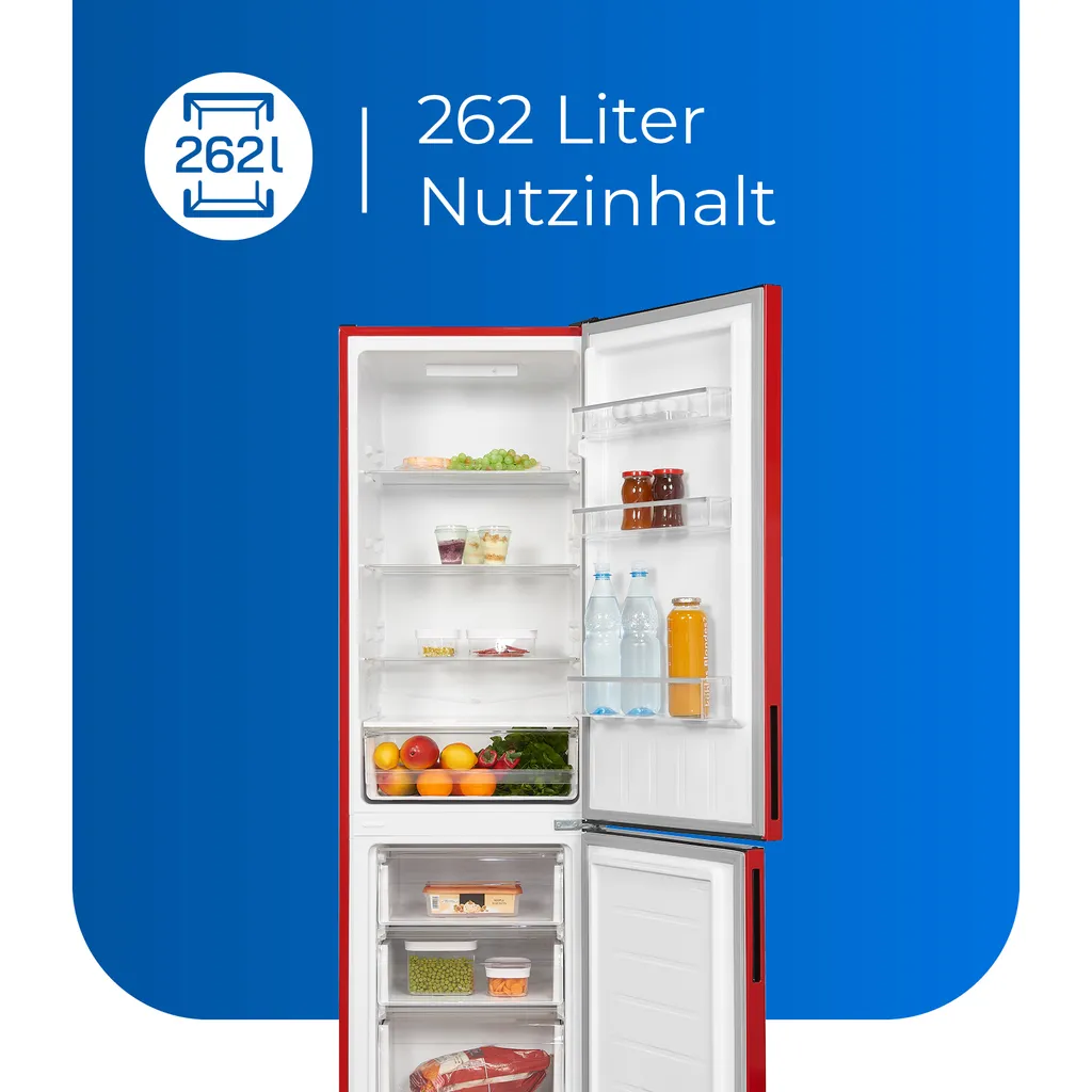 Die Kühl und Gefrierkombination ist die perfekte Lösung, wenn sie nur ein Gerät in ihrer Küche aufstellen aber trotzdem nicht auf ein großzügiges Gefrierfach verzichten wollen. Insgesamt stehen Ihnen 262 l Nutzinhalt zur Verfügung. Das Gerät in der Farbe Rot hat die Abmaße 176,0 x 54,0 x 55,0 cm (Höhe/Breite/Tiefe) und hat die Energieeffizienzklasse E (Skala Energieeffizienzklasse A bis G). Durch seine freistehende Bauart lässt es sich an jedem Ort aufstellen und in Betrieb genommen werden. Der wechselbare Türanschlag sorgt hierbei für noch mehr Flexibilität beim Aufstellen. Das Gerät bietet Ihnen über 187,0 l Nutzinhalt in seinem Kühlbereich, welcher mit Hilfe von teilweise verstellbaren Ablagen praktisch unterteilt ist. Das Gemüsefach hält dabei Obst und Gemüse allzeit knackig und frisch. Der 4*-Gefrierbereich verfügt über eine Kapazität von 75,0 l und bietet den idealen Ort für Eis, Tiefkühlpizza und alles andere. Mit der digitalen Temperaturanzeige haben sie jederzeit die gewählten Einstellungen im Blick. Über ein gut lesbares Display haben Sie die gewünschte Temperatur jederzeit im Blick und können bequem einzelne Funktionen des Gerätes steuern. Damit Sie auch bei schlechten Lichtverhältnissen zielsicher an Ihre Lebensmittel gelangen, bietet Ihnen das Gerät eine Beleuchtung.