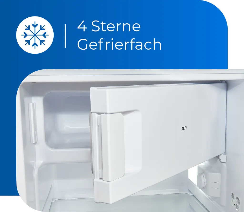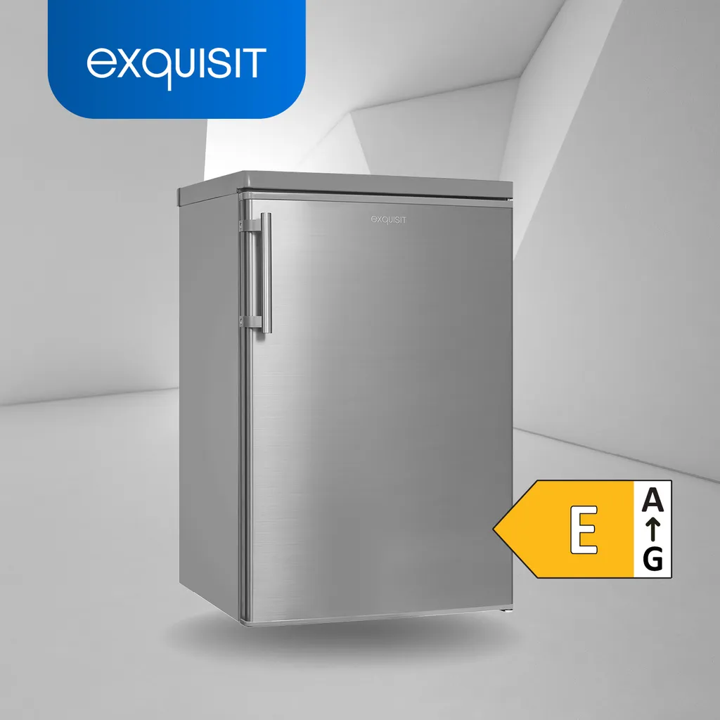 Der Kühlschrank sorgt für das komfortable und sichere Lagern Ihrer Lebensmittel und Getränke. Insgesamt stehen Ihnen 109 l Nutzinhalt zur Verfügung. Das Gerät in der Farbe Edelstahloptik hat die Abmaße 85,5 x 55,0 x 57,0 cm (Höhe/Breite/Tiefe) und hat die Energieeffizienzklasse E (Skala Energieeffizienzklasse A bis G). Durch seine freistehende Bauart lässt es sich an jedem Ort aufstellen und in Betrieb genommen werden. Der wechselbare Türanschlag sorgt hierbei für noch mehr Flexibilität beim Aufstellen. Das Gerät bietet Ihnen über 95,0 l Nutzinhalt in seinem Kühlbereich, welcher mit Hilfe von teilweise verstellbaren Ablagen praktisch unterteilt ist. Flaschen- und Butterfach schaffen Ordnung in Ihrem Kühlgerät. Der 4*-Gefrierbereich verfügt über eine Kapazität von 14,0 l und bietet den idealen Ort für Eis, Tiefkühlpizza und alles andere. Damit Sie auch bei schlechten Lichtverhältnissen zielsicher an Ihre Lebensmittel gelangen, bietet Ihnen das Gerät eine Beleuchtung.