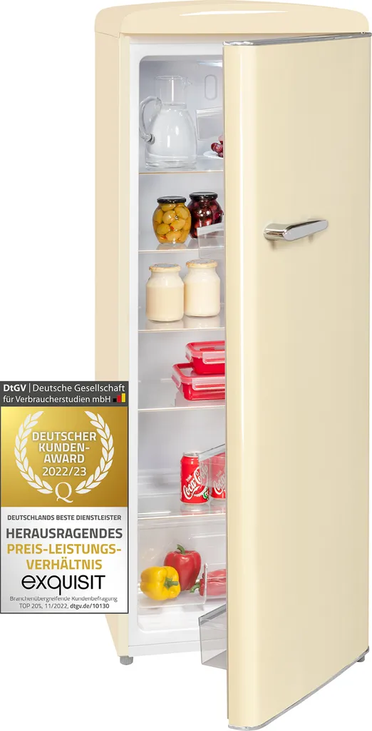Das Retro-Kühlgerät bietet ein hohes Maß an Funktionalität und jede Menge nützliche Features. Mit dem Vollmetallgriff lässt sich das Gerät angenehm öffnen und hält sich optisch an den trendigen Retro-Look. Insgesamt stehen Ihnen 229 l Nutzinhalt zur Verfügung. Das Gerät hat die Abmaße 144,0 x 54,5 x 57,5 cm (Höhe/Breite/Tiefe) und hat die Energieeffizienzklasse F (Skala Energieeffizienzklasse A bis G). Durch seine freistehende Bauart lässt es sich an jedem Ort aufstellen und in Betrieb genommen werden. Das Gerät bietet Ihnen über 229,0 l Nutzinhalt in seinem Kühlbereich, welcher mit Hilfe von teilweise verstellbaren Ablagen praktisch unterteilt ist. Das Gemüsefach hält dabei Obst und Gemüse allzeit knackig und frisch. Damit Sie auch bei schlechten Lichtverhältnissen zielsicher an Ihre Lebensmittel gelangen, bietet Ihnen das Gerät eine Beleuchtung.