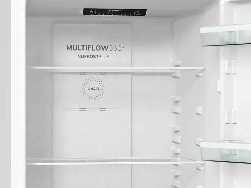 LED Display, digitale Temperaturanzeige für Kühl- und Gefrierfach, NoFrost, IonAir und MultiFlow 360°, CrispZone mit Feuchteregler, AdaptTech, FastFreeze, EcoMode-Programm, 4 Glasabstellflächen, 1 Flaschenablage ohne Flaschenhalter, 2 höhenverstellbare Ab