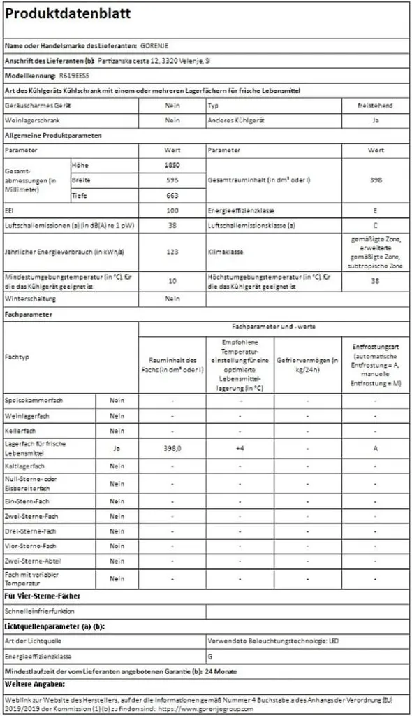 - Lagerfach für frische Lebensmittel: 398 Liter