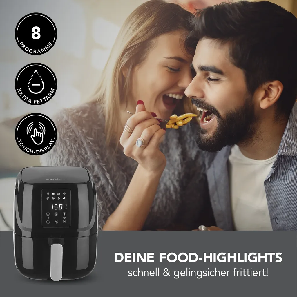 Knusprige Pommes frites, ohne zusätzliches Fett frittiert – mit der digitalen Heißluft-Fritteuse von MAXXMEE ist das kein Problem mehr! Die clevere Kombination aus schnell zirkulierender heißer Luft und einem Heizelement gart deine Lieblingsspeisen nicht nur extra schnell und schonend, sondern benötigt auch deutlich weniger Energie und Fett als herkömmliche Geräte.