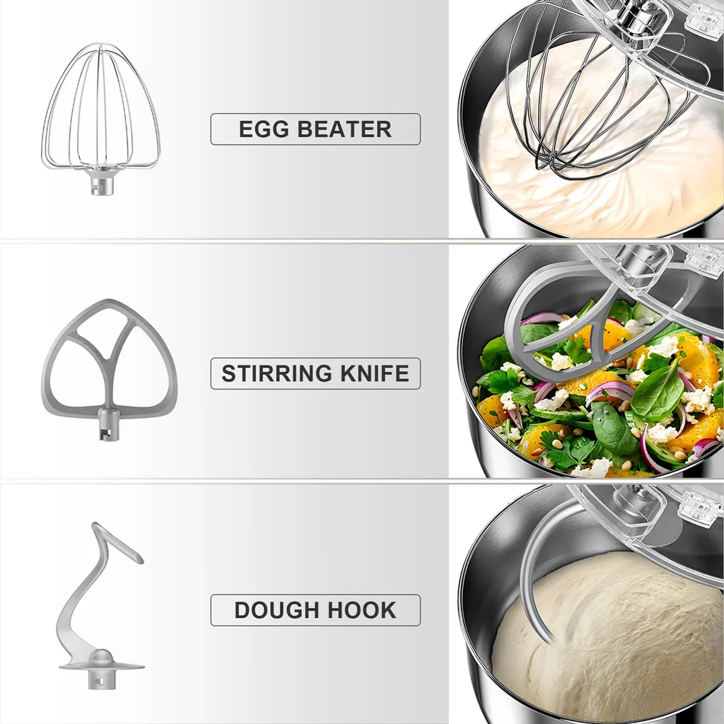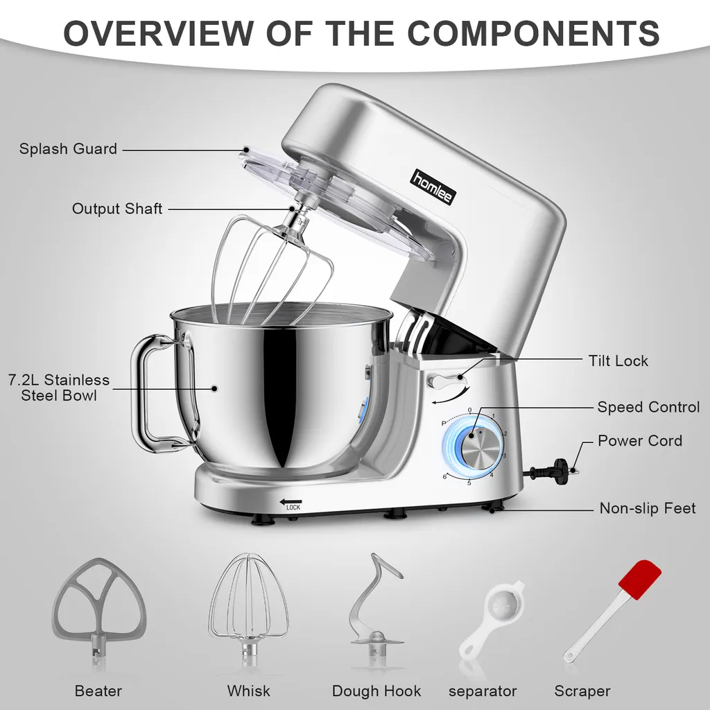 - 【7,2-l-Schüssel mit großem Fassungsvermögen und Griff】Die 7,2-l-Edelstahlschüssel kann fast alle Ihre Küchenanforderungen erfüllen. Die Küchenmaschine ist einfach zu bedienen und kann Kuchen,Brot, Kekse und Gebäck für eine Vielzahl von Speisen zum Frühstück und Abendessen zubereiten.