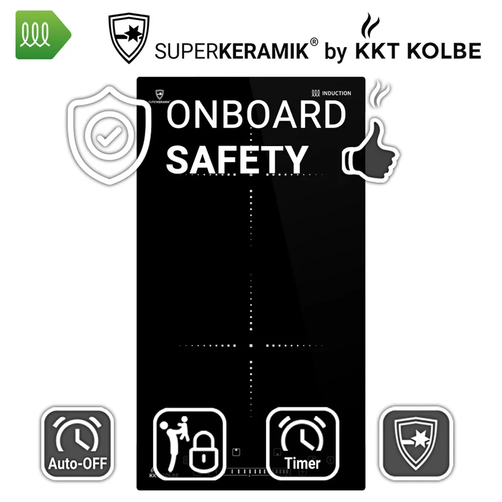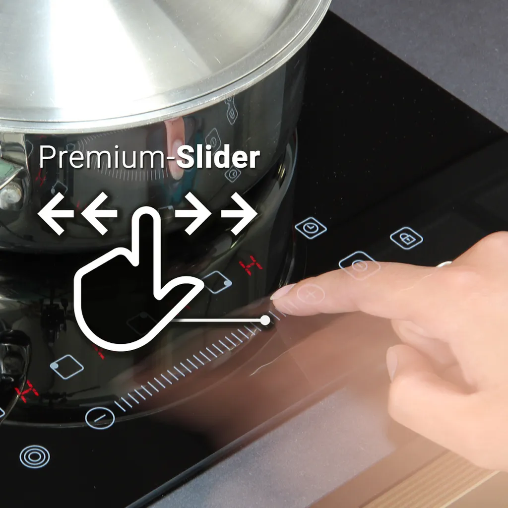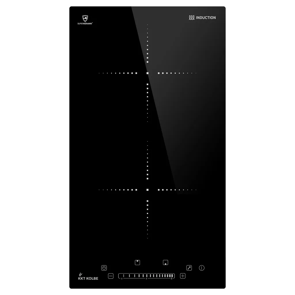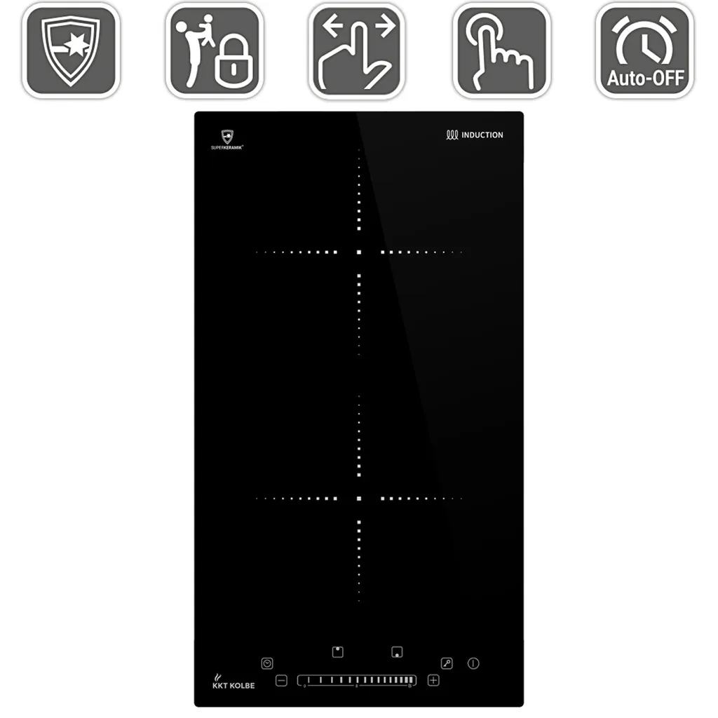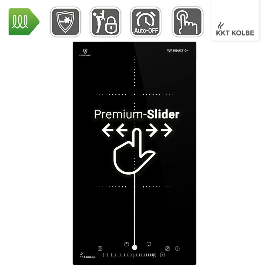 Das KKT KOLBE Induktions-Kochfeld überzeugt durch eine hochwertige Verarbeitung und Funktionalität. Das Kochfeld verfügt über 2 Kochzonen. Alle Kochzonen verfügen über 15 Schaltstufen mit der Möglichkeit die induktive Leistung konstant abzugeben. Herkömmliche Intervall- bzw. Heizphasen entfallen somit und Sie können Ihre Lebensmittel gleichmäßig Kochen und Braten. Die Oberfläche aus hochwertiger SUPERKERAMIK®-Glaskeramik sorgt für Qualität und Sicherheit und ist einfach zu reinigen. Das Gerät kann mittels TouchSelect Sensortasten bequem bedient werden. Mit dem Slider des Bedienpanels können Sie mit einem Wisch die Temperaturstufe der Kochplatten einstellen. Der integrierte Booster sorgt für ultraschnelle Aufheizzeiten des Kochgeschirrs. Mit der Timer-Funktion können Sie Kochzonen zeitgesteuert abschalten. Die LED-Anzeige zeigt alle wichtigen Informationen bequem auf einen Blick.
