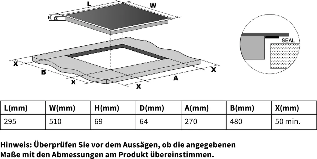 Hinweis: Überprüfen Sie vor dem Aussägen, ob die angegebenen Maße mit den Abmessungen am Produkt übereinstimmen.