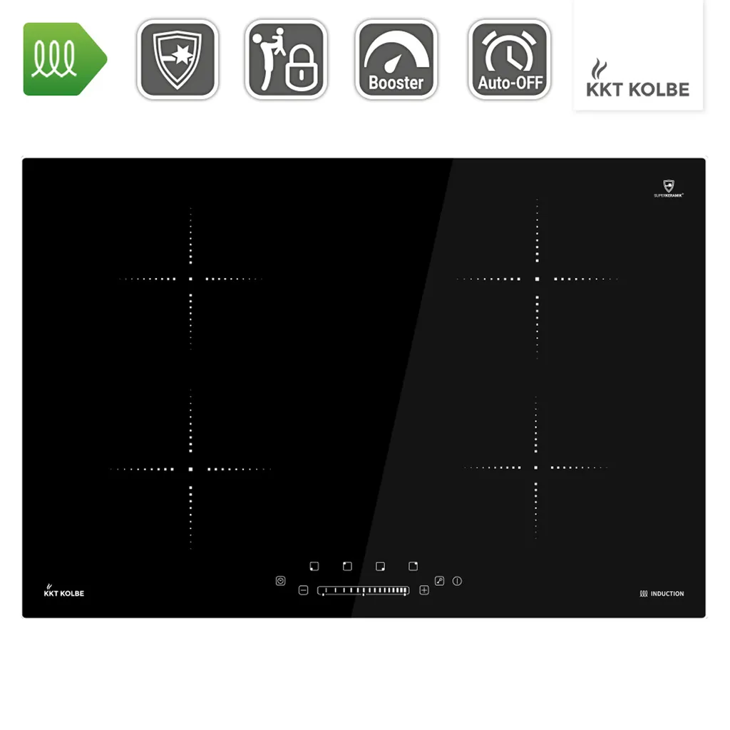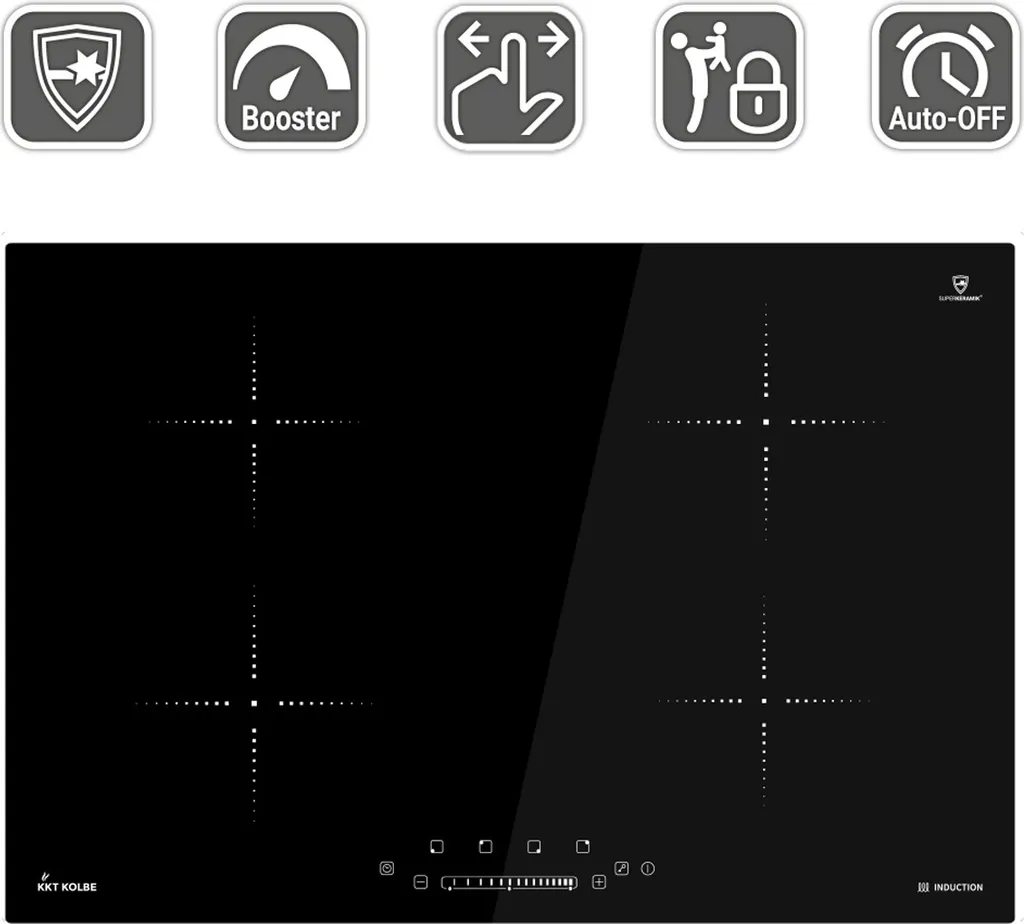 Das KKT KOLBE Induktions-Kochfeld überzeugt durch eine hochwertige Verarbeitung und Funktionalität. Das Kochfeld verfügt über 4 Kochzonen. Die Oberfläche aus hochwertiger SUPERKERAMIK®-Glaskeramik sorgt für Qualität und Sicherheit und ist einfach zu reinigen. Das Gerät kann mittels TouchSelect Sensortasten bequem bedient werden. Mit dem Slider des Bedienpanels können Sie mit einem Wisch die Temperaturstufe der Kochplatten einstellen. Verwandeln Sie Ihr Induktionskochfeld in eine Grillstation! Mithilfe der BBQ-Funktion und einer handelsüblichen induktionsgeeigneten Grillplatte grillen Sie Fleisch und Gemüse gleichmäßig. Alternativ nutzen Sie diese Funktion mit Topf oder Pfanne zum „scharfen“ Anbraten Ihrer Lebensmittel. Der integrierte Booster sorgt für ultraschnelle Aufheizzeiten des Kochgeschirrs. Mit der Timer-Funktion können Sie Kochzonen zeitgesteuert abschalten. Die LED-Anzeige zeigt alle wichtigen Informationen bequem auf einen Blick.