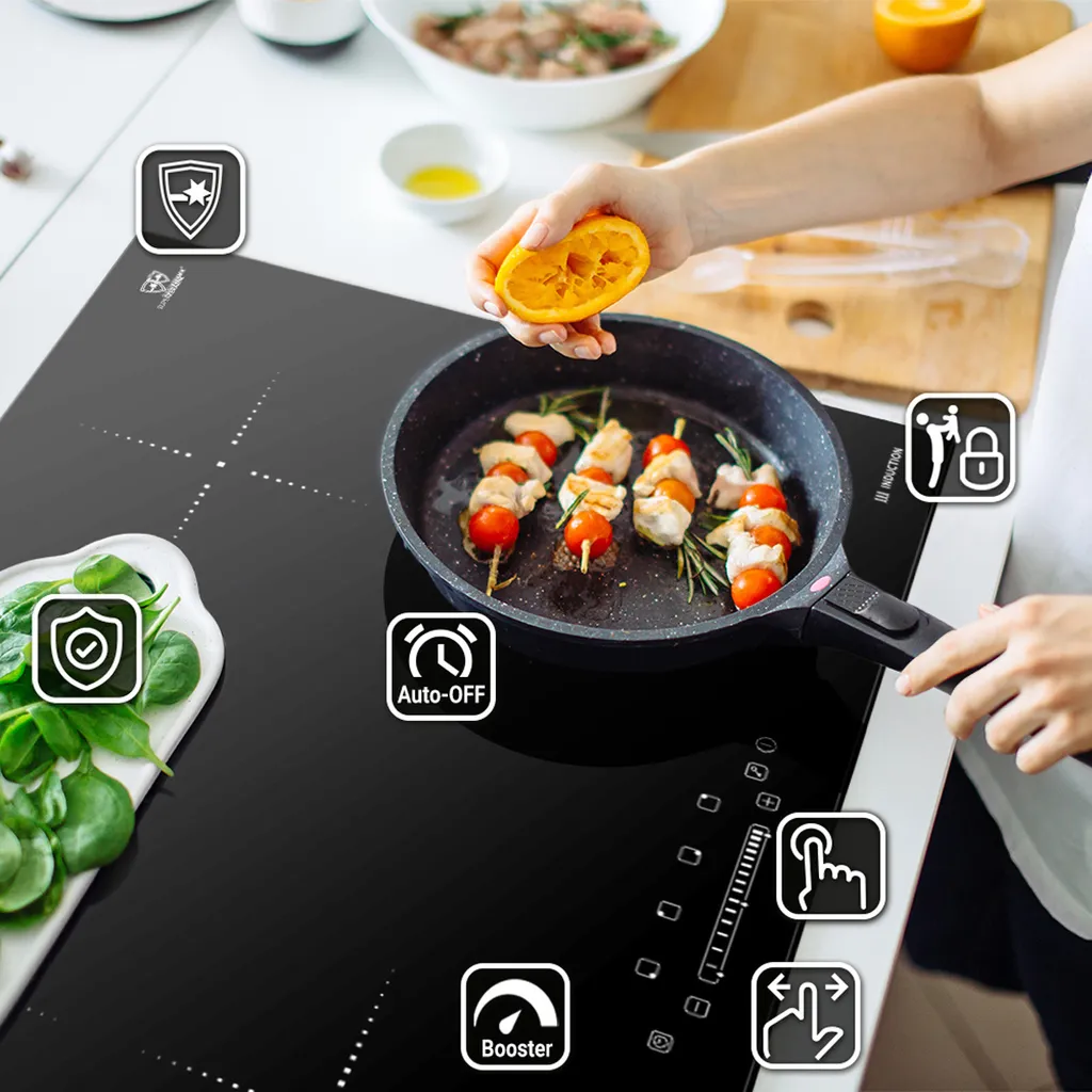 Das Gerät ist mit einer Kindersicherung ausgestattet. Wenn sich kein passendes Kochgeschirr auf der Kochzone befindet, wird diese automatisch abgeschaltet. Die Breite des Kochfelds beträgt 77cm und eignet sich für geräumige Küchen.