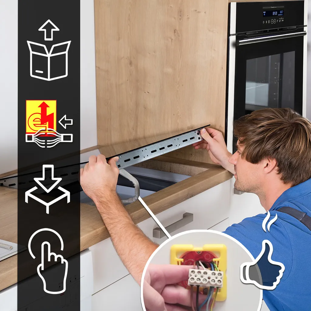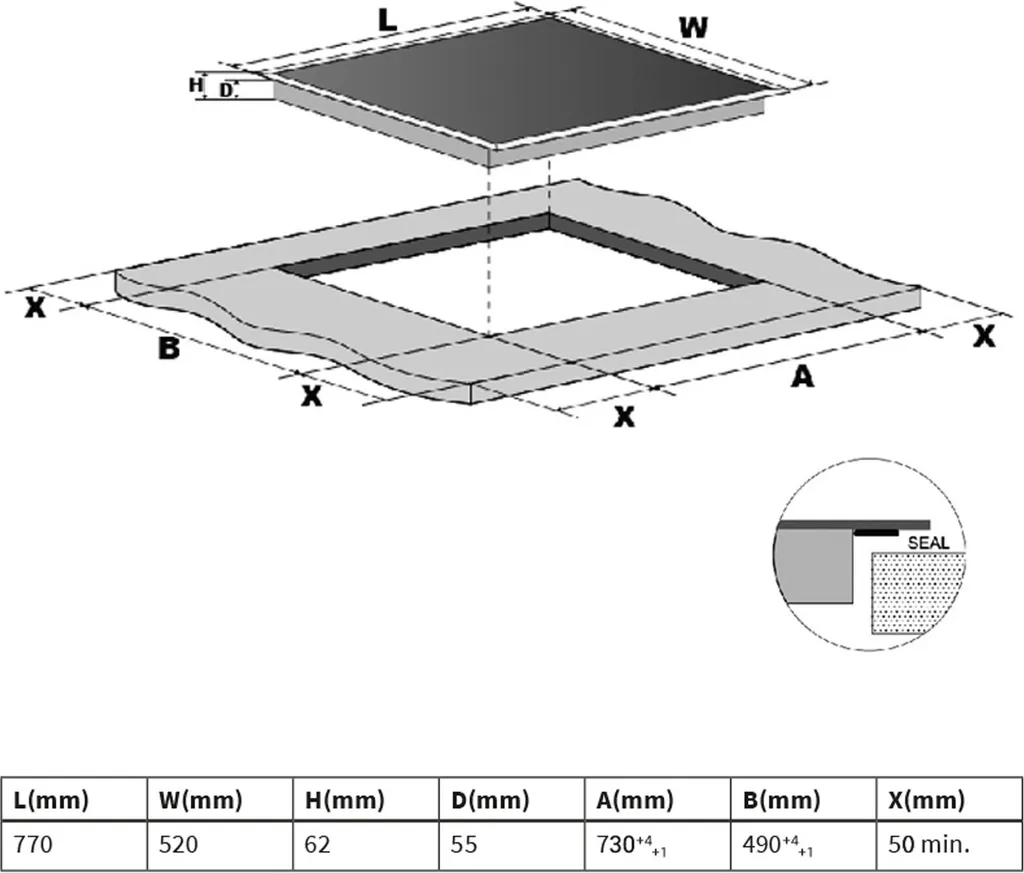 Bitte beachten Sie, dass unter dem Kochfeld ca. 5 cm Luft zur Kühlung der Induktionsspulen vorhanden sein muss. Vorne zwischen Arbeitsplatte und Backofenblende / Tür muss ein Schlitz vom 5mm x 560mm sein. Die Holztraverse des Schrankes – sofern vorhanden – muss entfernt werden. Das Gerät ist autark, kann also unabhängig von anderen Geräten in Ihre Küche eingebaut werden.