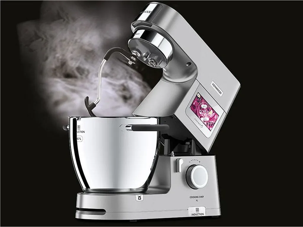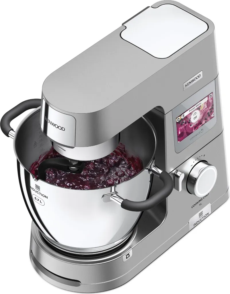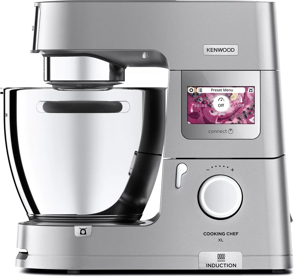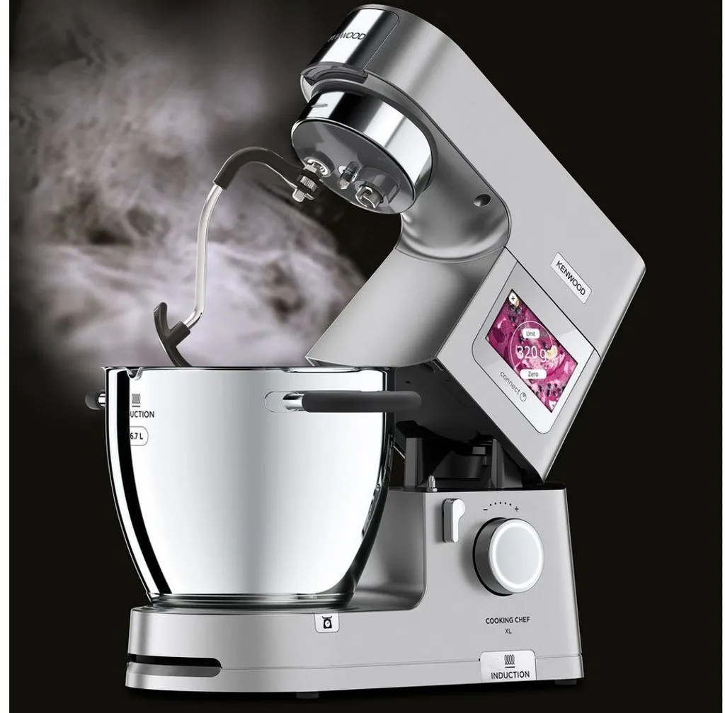 Besondere Merkmale: Connected: Inspiration von der Kenwood World App direkt an die Küchenmaschine senden, Induktionskochen: von 20 bis 180 °C gradgenau temperieren, EasyWeigh Waage: mit der integrierten Waage direkt in der Schüssel wiegen, CookAssist Touchscreen: zur einfachen Bedienung, SimpleTouch: 13 voreingestellte Programme, Pulse- und Unterhebfunktion sowie 3 Rühr-Intervallstufen