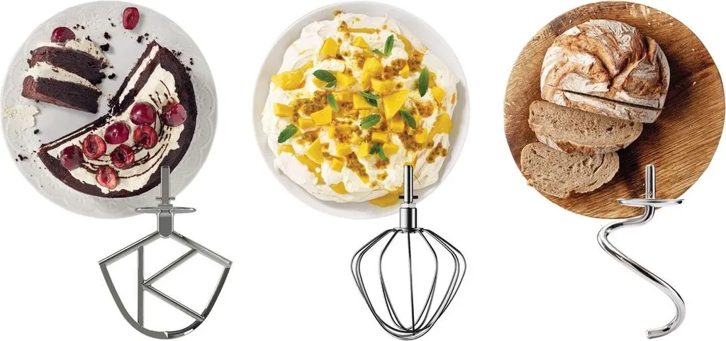 - 3 Rührelemente aus Edelstahl: K-Haken, Ballonschneebesen, Knethaken