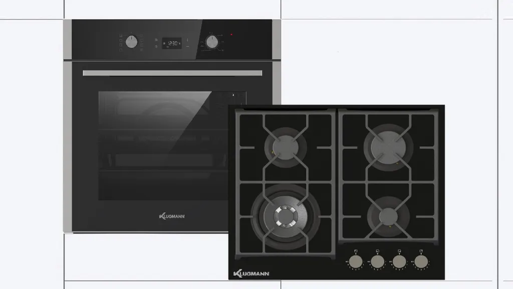 Klugmann Gasherd-Set KO608.5TCX+KT600B5, Mit 1-fach-Teleskopauszug, Einbaubackofen Design Hochwertige Qualität KO608.5TCX Autark 60cm, 3D Heißluft, Grill-/Brat-System, Timer, 68L, Touch, Edelstahl, Teleskop-Vollauszug, Aqualystic Easy-To-Clean Emaille, Anti-Fingerprint, Von 0 °C Bis 285 °C