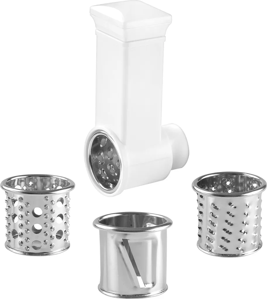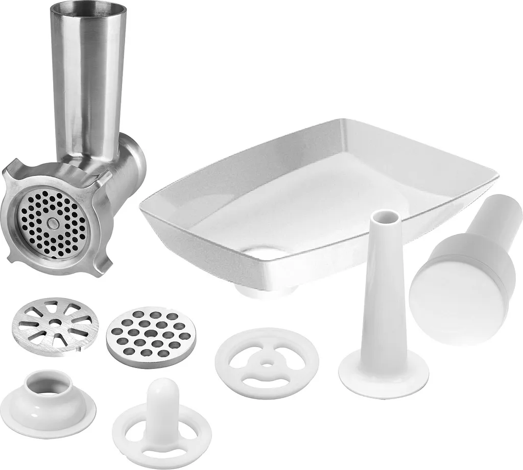Zur Mühle ist auch Aufsatz für die Herstellung von Wurst – hausgemachte Wurst und Leberwurst. Weitere Teile sind Ansatz für Kebbe und Ansatz mit 4 Trommelreiben für Reiben von Salaten, Nüssen, Semmelbrösel usw. Zum Zubehör gehören außerdem ein Kunststofftrichter, ein Stampfer, eine transparente Abdeckung für die Rührschüssel und Entriegelungsschlüssel.