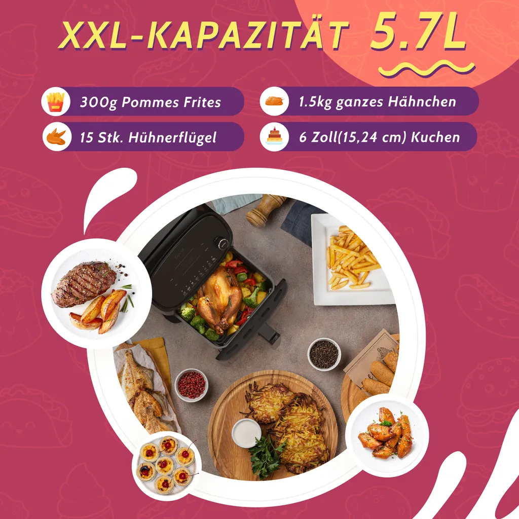 - Weitere: Rezeptbuch auf Deutsch, PFOA-frei, BPA-frei, Mit dem Griff, 5.7L XXL Fassungsvermögen, LED-Touch-Display mit Knopf, Platzsparend und stilvoll, Antihaftbeschichtet, Transparentes Sichtfenster, 8 voreingestellte Kochprogramme
