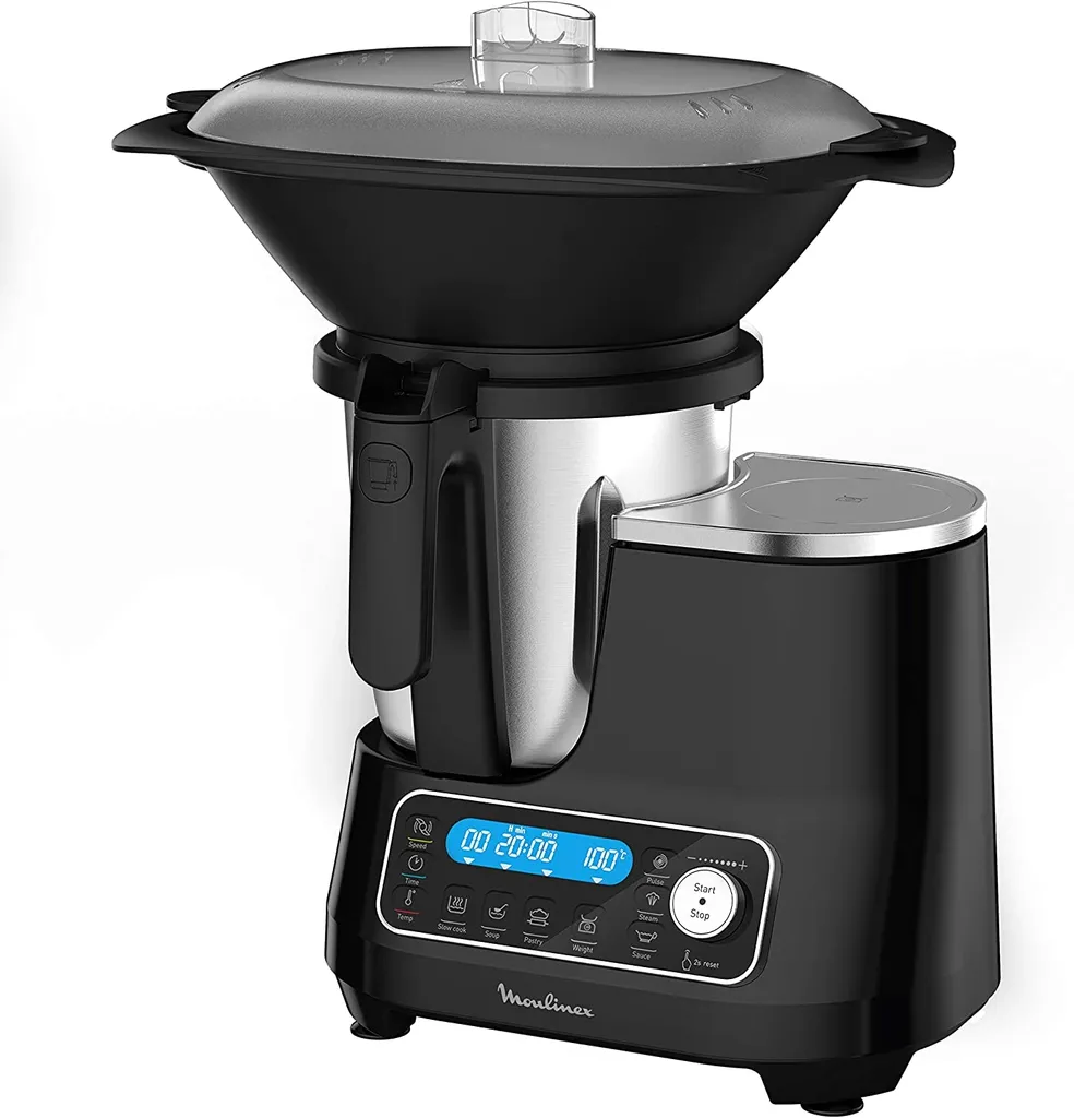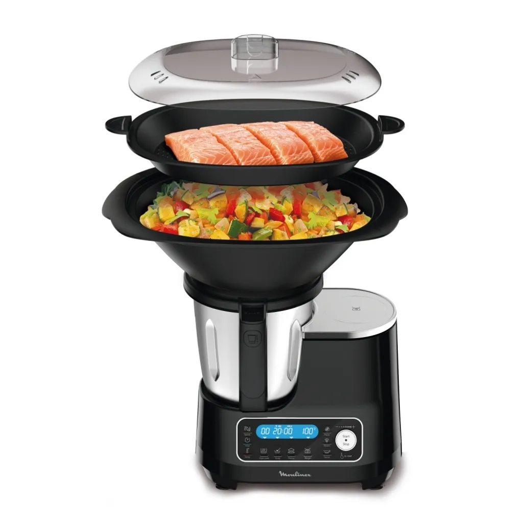 Mit der ClickChef Küchenmaschine mit Kochfunktion von Moulinex verbringen man weniger Zeit in der Küche und kann dennoch leckere hausgemachte Kost servieren. Die Küchenmaschine verfügt über 25 Funktionen – von Köcheln oder Dampfkochen, bis Schlagen, Kneten, Hacken und mehr – über eine intuitive Bedienoberfläche mit 5 automatischen Programmen und manuellen Einstellungen lässt sich die ClickChef einstellen. Mahlzeiten lassen sich dank einer großen Bandbreite an Zubehörteilen, einschließlich eines großen externen Dampfgarers, für gesundes Kochen rasch und mühelos zubereiten. Trotz ihrer kompakten Größe bietet diese Küchenmaschine mit Kochfunktion ein großzügiges Fassungsvermögen für bis zu vier Personen. Mit einer integrierten Messskala ist sie einfach zu reinigen und zu verstauen, da alles in die Schüssel passt.