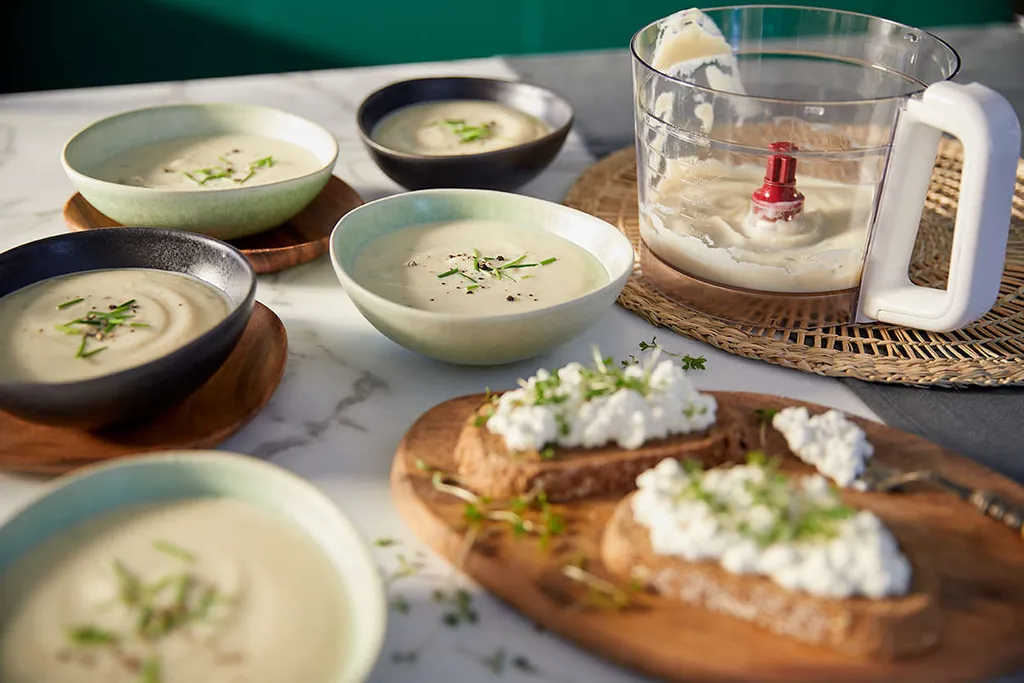 Mit der großzügigen 2,1-l-Schüssel (1,5 l max. Fassungsvermögen) können Sie bis zu 5 Portionen kalter Suppe auf einmal zubereiten.