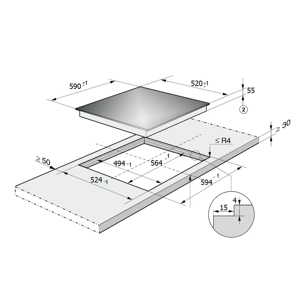 - Abmessungen Aussägung Kochfeld Breite: 56,00 cm
