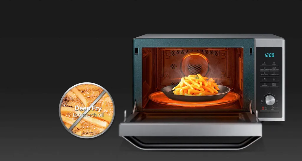 Die Slim-Fry-Funktion von Samsung frittiert Lebensmittel mit einer Kombination aus Mikrowellen-, Grill- und Heißluftfunktion. Dieses ausgeklügelte Verfahren sorgt gemeinsam mit der Crusty Plate fast ohne Öl für optimale Frittierergebnisse. Den Unterschied sieht und schmeckt man!