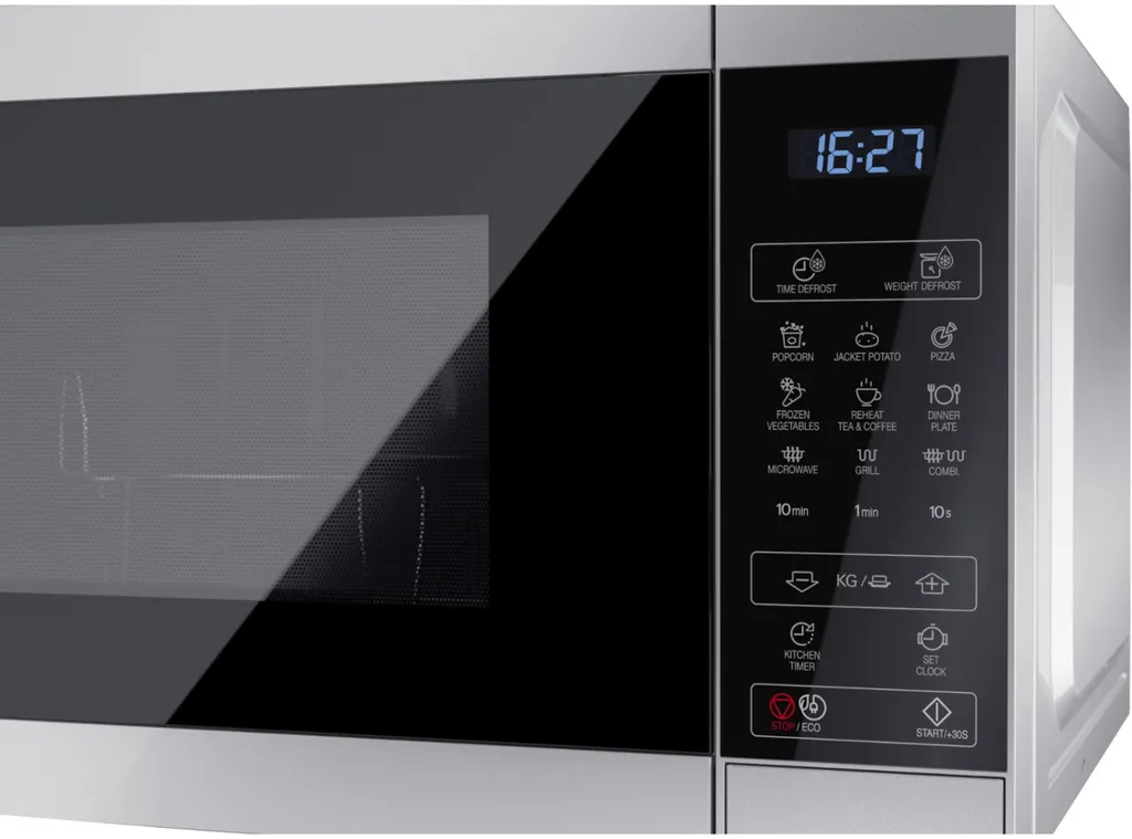 - Elektronische Steuerung, Auftaufunktion, Timer-Funktion und Uhr, Kindersicherung, Garraum-Beleuchtung, ECO-Funktion