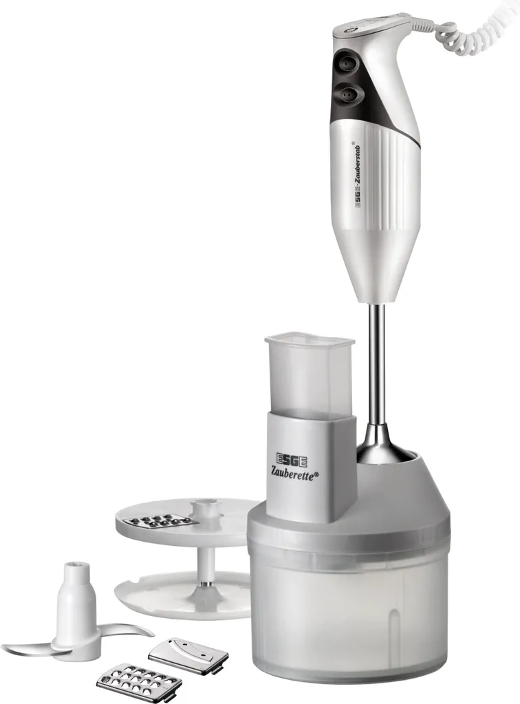 Raspeln, hobeln, hacken – die Zauberette von ESGE ist die ideale Ergänzung, um aus Ihrem ESGE-Zauberstab noch mehr herauszuholen. Die Zauberette wird ohne Zauberstab geliefert, ist jedoch für jedes Modell geeignet und erweitert den Einsatzbereich der Stabmixer um 4 Funktionen. Denn die Zauberette ist gleich mit 4 Einsätzen ausgestattet, mit denen sich Fleisch oder Kräuter zerkleinern, Käse und Nüsse fein oder grob raspeln und Obst und Gemüse in Scheiben schneiden lassen. Dazu verfügt die Zauberette über einen Scheibenträger aus Kunststoff, in den die 2 Raspelscheiben (Nr. 2: mittel/Nr. 3: grob) oder die feine Schneidscheibe Nr. 4 eingesetzt werden können. Der Scheibenträger sitzt in einem großen halbtransparenten Kunststoffbehälter, der mit einem Durchmesser von 14 cm reichlich Platz für das Schnittgut bietet. Damit Sie die zu verarbeitenden Zutaten gefahrlos und bequem nacheinander einfüllen können, ist der Deckel mit einem großen Einfüllschacht versehen. Mit Hilfe des Stopfers lassen sich die Zutaten zudem besonders leicht Richtung Messer drücken. Sie können Lebensmittel außerdem auch mühelos fein zerhacken. Dazu den Scheibenträger aus dem Behälter herausnehmen und durch das 2-flügelige Hackmesser ersetzen. Raspel- und Schneidscheibe sowie Hackmesser sind aus hochwertigem Edelstahl gefertigt und somit äußerst robust und lang anhaltend scharf. Edelstahl ist außerdem geruchs- und geschmacksneutral, sodass Sie die Zauberette für die verschiedensten Zutaten verwenden können, ohne dass fremde Aromen übertragen werden. Nach Gebrauch lassen sich alle Teile außer dem Getriebeaufsatz bequem in der Spülmaschine reinigen.